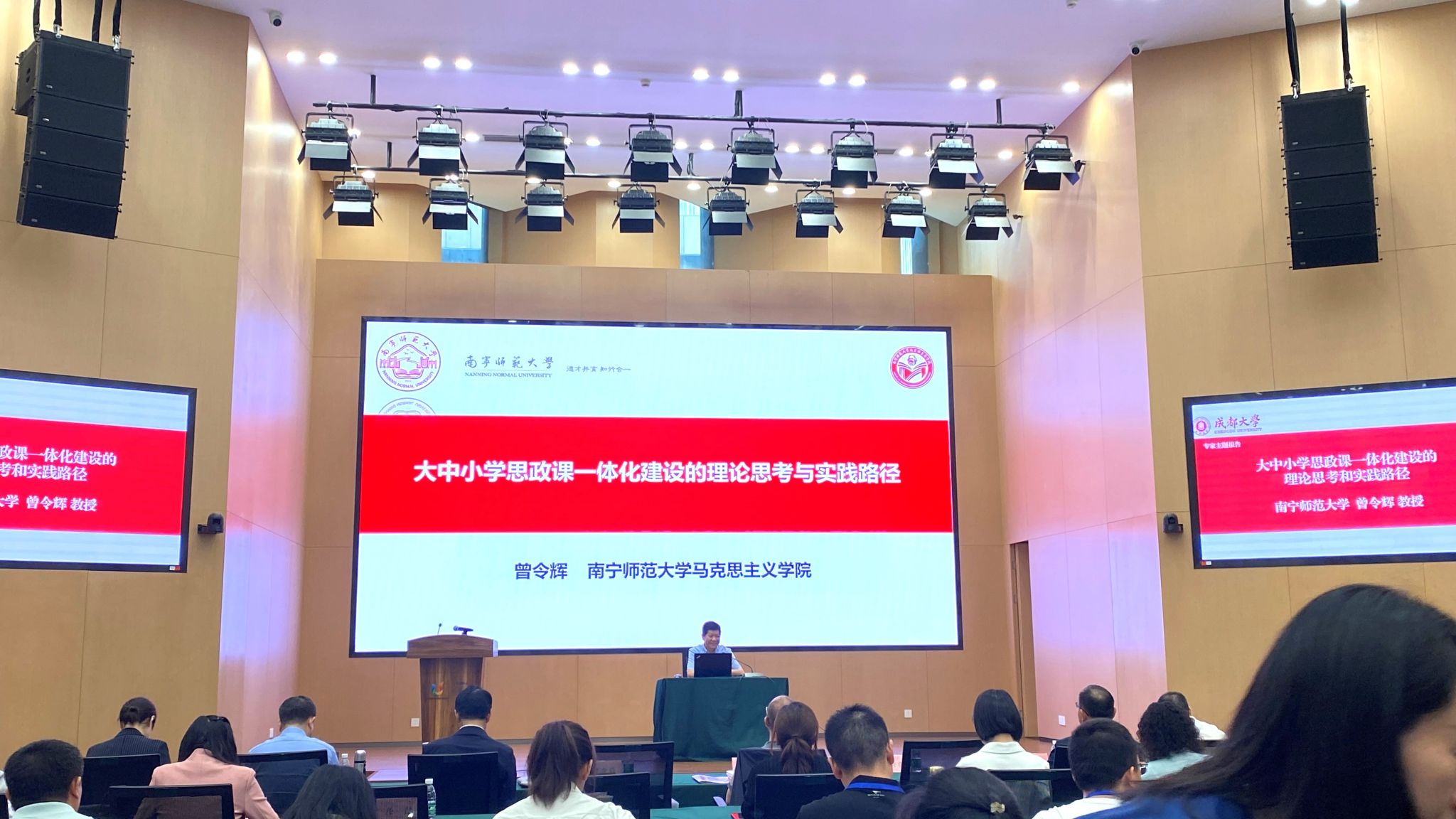 本次会议聚焦大中小学思想政治教育一体化建设发展主题。会上,中国教育发展战略学会思想道德建设专委会理事长、北京师范大学思想政治工作研究院经理冯刚教授以“深化大中小学思想政治教育一体化的环境建构”为题作主旨报告,深入探讨了大中小学思想政治教育一体化环境建构的价值意蕴、时代特征和推进策略。曾令辉经理在专家主题报告阶段做了题为“大中小学思政课一体化建设的理论思考和实践路径”的主题报告,曾经理从大中小学思政课一体化“为什么化”“化什么”“怎么化”三个角度展开讨论,从理论层面和实践层面全面阐述了当前大中小学思政课一体化发展面临的现实问题,指出推进大中小学思政课一体化教学改革创新不是零散的“化”,而是推进全方面、全过程的整体“化”,重点提出了以“育人共同体”“知识链”“能力链”和“价值链”为核心的“一体三链”育人新体系,同时向与会领导和专家学者介绍了广西壮族自治区各市大中小学各学段思政课主题教学的开展情况和取得的成效。报告受到与会领导和专家学者们的高度认可和赞誉。