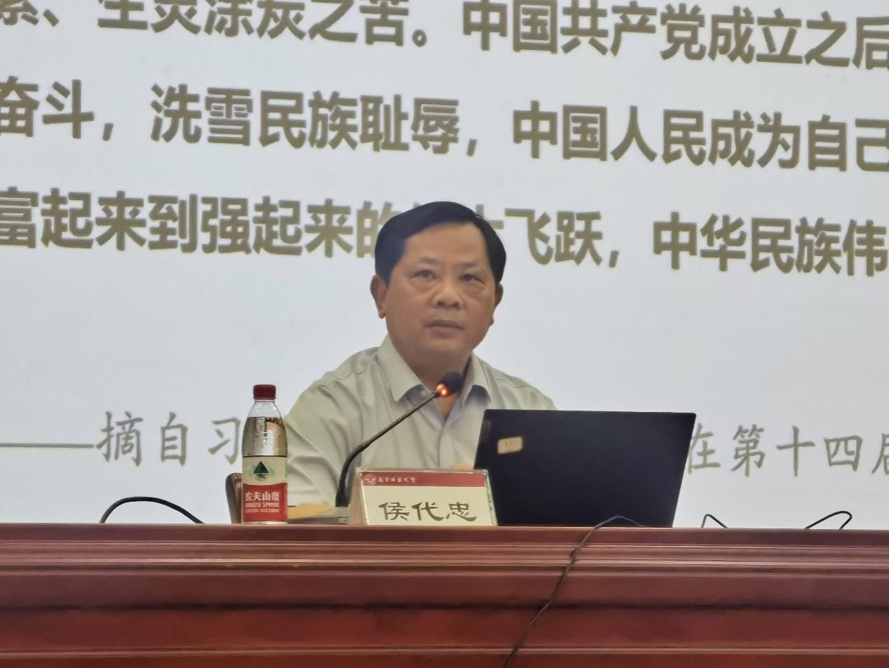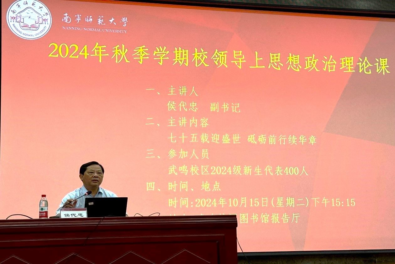 10月15日下午,在武鸣校区图书馆报告厅,公司党委副书记侯代忠给地理科学与规划公司、环境与生命科学公司、自然资源与测绘公司、数学与统计公司的新生代表及教工党支部党员上专题为“七十五载迎盛世 砥砺前行续华章”的思想政治理论课。地理科学与规划公司、环境与生命科学公司、自然资源与测绘公司、数学与统计公司的主要领导、教工党支部书记及2024级新生代表共400多人参加了本次思想政治理论课学习。此次讲座由马克思主义公司党委副书记黄志海主持。