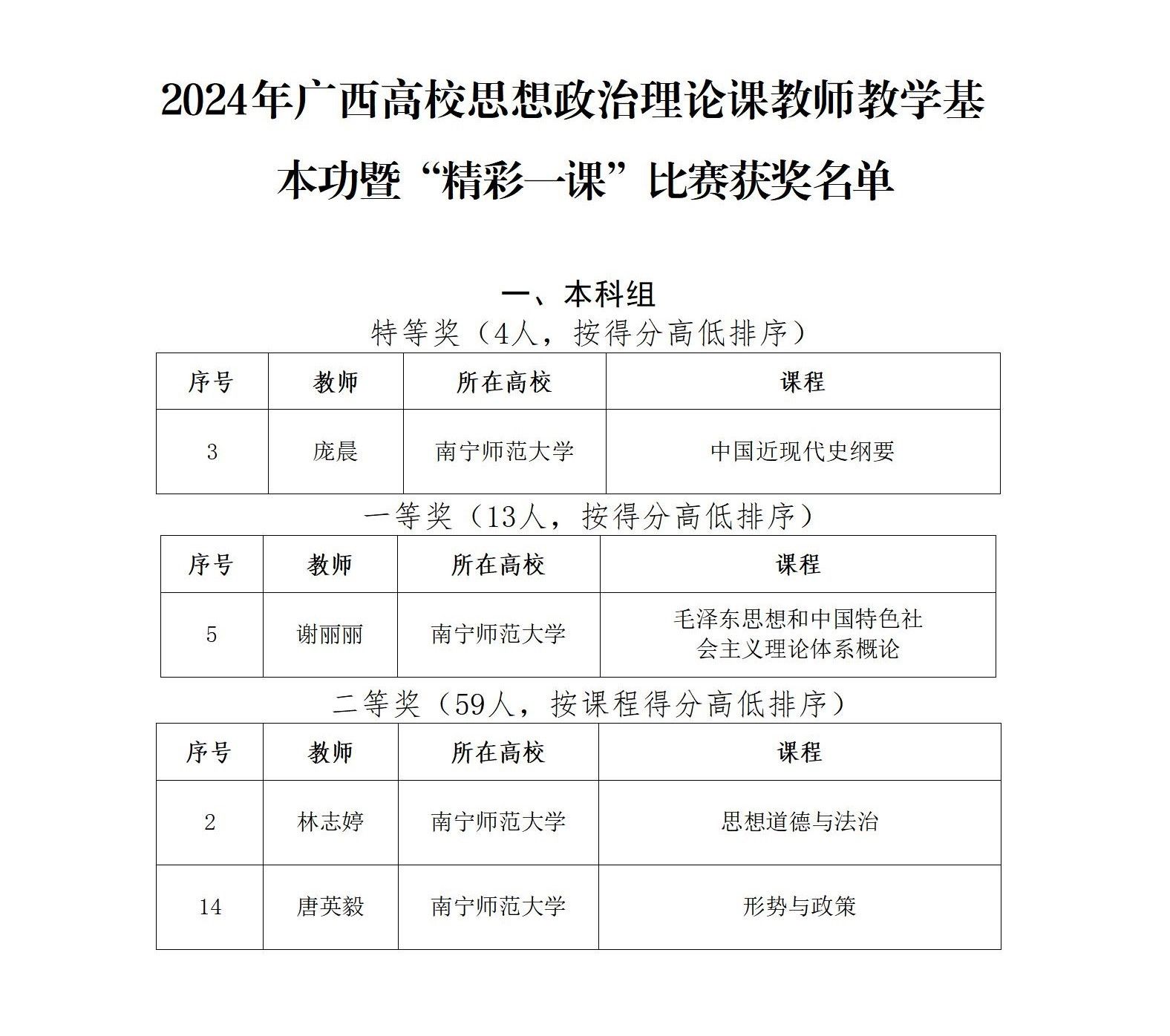 近日,自治区教育厅公布了2024年广西高校思想政治理论课教师教学基本功比赛暨“精彩一课”评选活动获奖名单,十大正规买足球网站教师庞晨荣获特等奖,谢丽丽荣获一等奖,林志婷、唐英毅荣获二等奖。