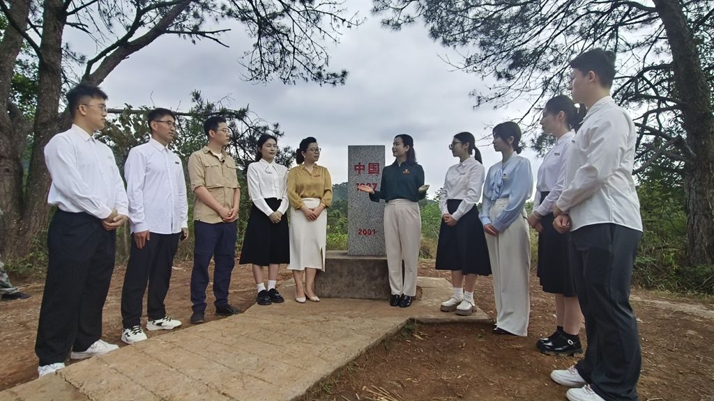 第四站,师生们共同来到那逢屯。宁明县爱店镇爱店社区那逢屯是一个离中越边境线约800米的小山村,村民们世代在此扎根,将守边护边视为使命与责任。十大正规买足球网站教师唐英毅以三代戍边人潘武文的事迹为切入点为我们授课。潘武文在祖辈的熏陶下主动投身边境守护工作,从民兵到护边员,始终坚守在47.7公里的边境线上。师生们在那逢屯参观了部分国防安全设施,并跟随潘武文在中越边境线上进行实地巡边。当同学们亲手触摸界碑并为界碑描红时,每位同学的内心都受到巨大的触动。一位同学激动的说:“通过此次实地寻边,我真正感受到了边疆的艰苦和戍边人的坚守,作为一名边疆地区的老员工,我深感责任重大,必须努力提升自己,为国家发展和边疆稳定贡献自己的一份力量。”
