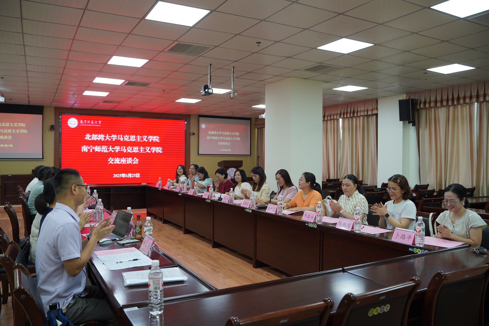 随后,双方在8B215学术报告厅进行座谈。经理助理谢丽丽对北部湾大学十大正规买足球网站的来访表示欢迎,并简要介绍公司办学历史、团队建设及教学改革成果,重点阐述“行走的思政课”特色课程建设,强调公司以改革创新增强思政课思想性与亲和力,落实立德树人根本任务。座谈会上,双方聚焦思想道德与法治教研室建设、思政课理论创新与实践改革、集体备课、教学比赛及考评方式等议题深入探讨。颜文娟对公司的接待表示感谢,提出加强两院合作、共享经验的意愿。