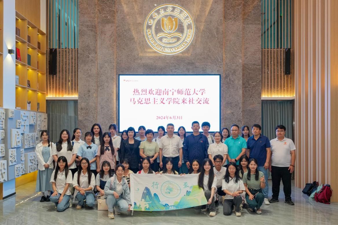 6月3日下午,研学队伍前往西南大学出版社,先后聆听了出版社杨毅书记作题为《努力把一个群体带向优秀》、西南大学出版社基础教育事业部总编辑王宁作题为《中小学教材编写与出版——探索新时代教育的新路径》和西南大学出版社职业教育分社副社长曾文作题为《书籍的前世、今生、未来》的主题报告。杨毅书记结合自身当班主任的工作经历,诠释了“什么是优秀”“作为教师,如何引领员工走向优秀”,并希望同学们在未来能够找准目标,明确方向,规划好未来。杨毅书记还分享几位优秀员工考研成功上岸的案例让同学们感受榜样的力量,同时期望同学们能够下苦功夫,抓住机会,努力提升自身,在向着自己的目标迈进中笃行拼搏。王总编辑的报告向同学们介绍西南大学版中小学教材编写实践,让我们认识到教材编写的严谨性和课程标准的重要性。曾副社长结合各种书籍实物,就图书的发展历史进行介绍,带我们一起走进书籍的前世今生,让我们感受到书籍的魅力,激励大家爱上阅读。