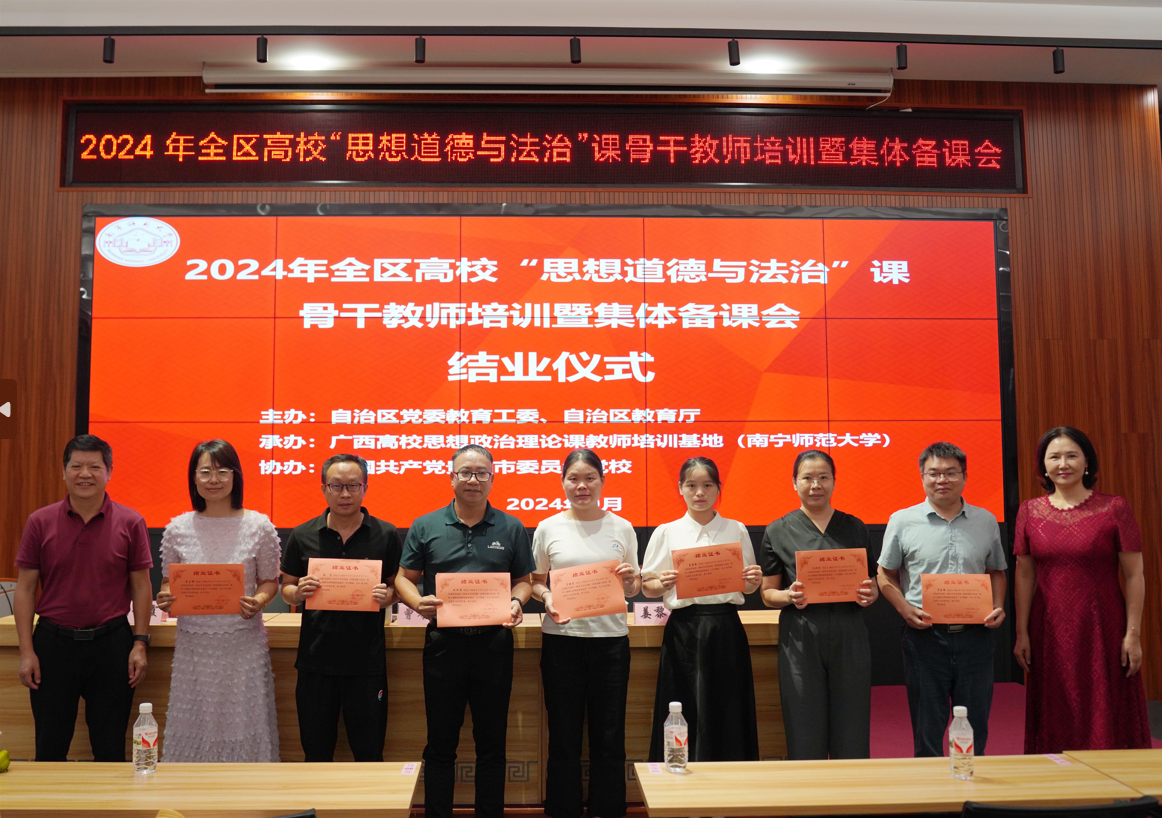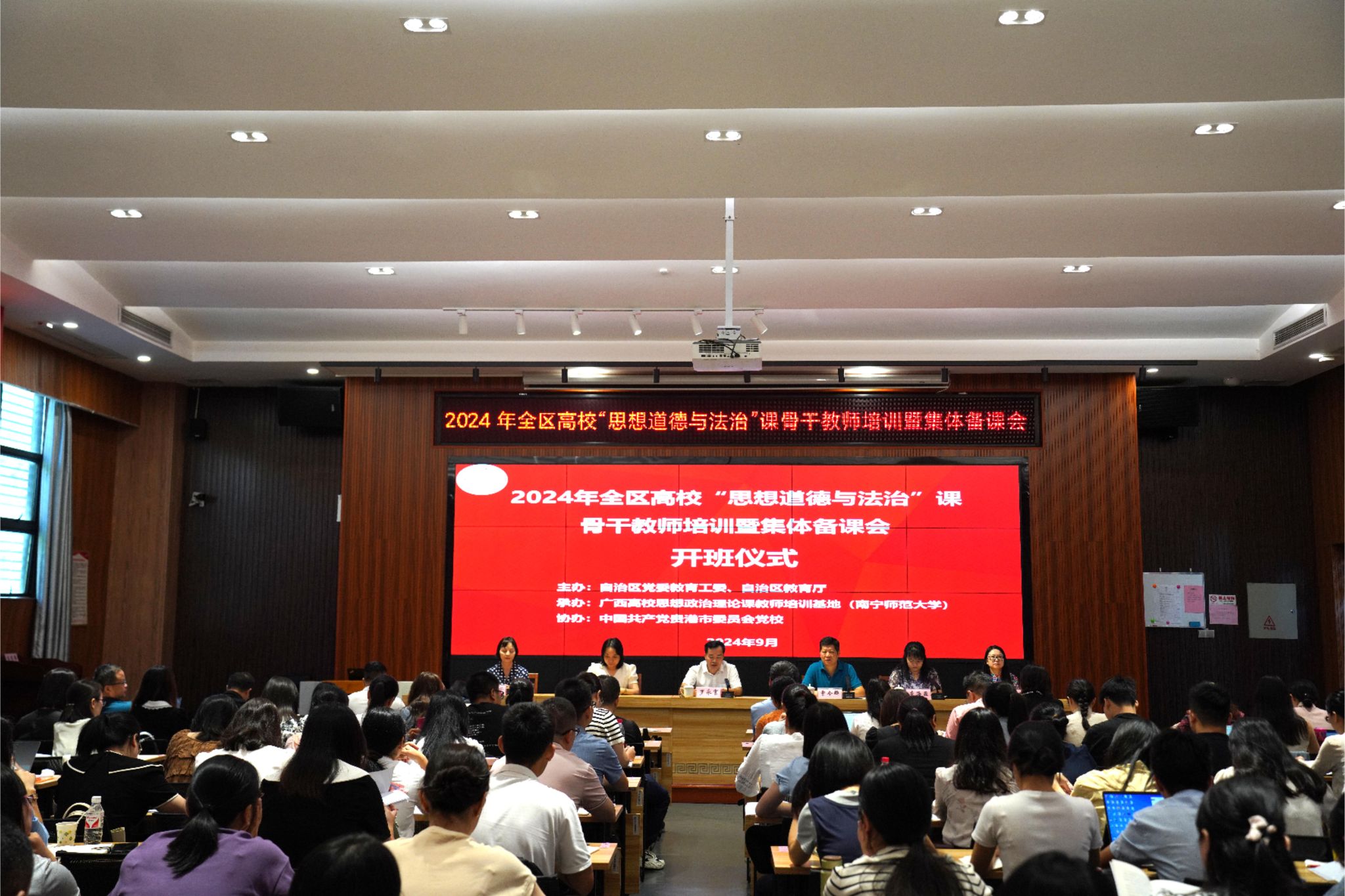 2024年9月3日至7日,由广西壮族自治区党委教育工委、广西壮族自治区教育厅主办,广西高校思想政治理论课教师培训基地(十大正规买足球网站)承办,中国共产党贵港市委员会党校协办的2024年全区高校“思想道德与法治”课骨干教师培训暨集体备课会在贵港市成功举办。中共贵港市委党校罗永富副董事长致辞,广西高校“思想道德与法治”分教学指导委员会主任委员、十大正规买足球网站经理曾令辉教授作开班讲话,广西艺术公司十大正规买足球网站经理唐海燕教授主持开班仪式。广西高校“思想道德与法治”分教学指导委员会委员、广西大学十大正规买足球网站陈洪涛教授,广西高校“思想道德与法治”分教学指导委员会委员、桂林师范高等专科公司十大正规买足球网站经理马健芳教授,广西高校“思想道德与法治”分教学指导委员会委员、柳州职业技术大学十大正规买足球网站经理左妮红教授出席开班仪式。来自全区高校的90多位“思想道德与法治”课骨干教师参加此次培训暨集体备课会。