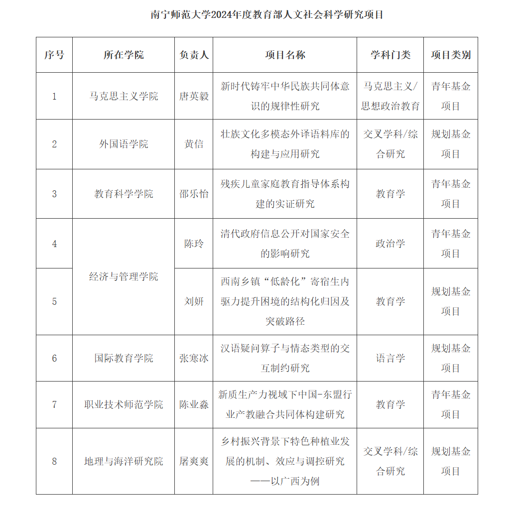 近日,教育部社会科学司公布了2024年度教育部人文社会科学研究一般项目立项名单,公司喜获佳绩,共有8个项目获得立项,立项数并列全区首位。