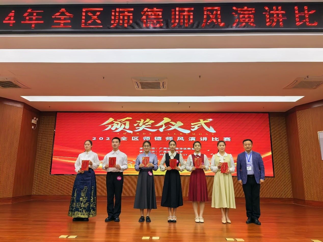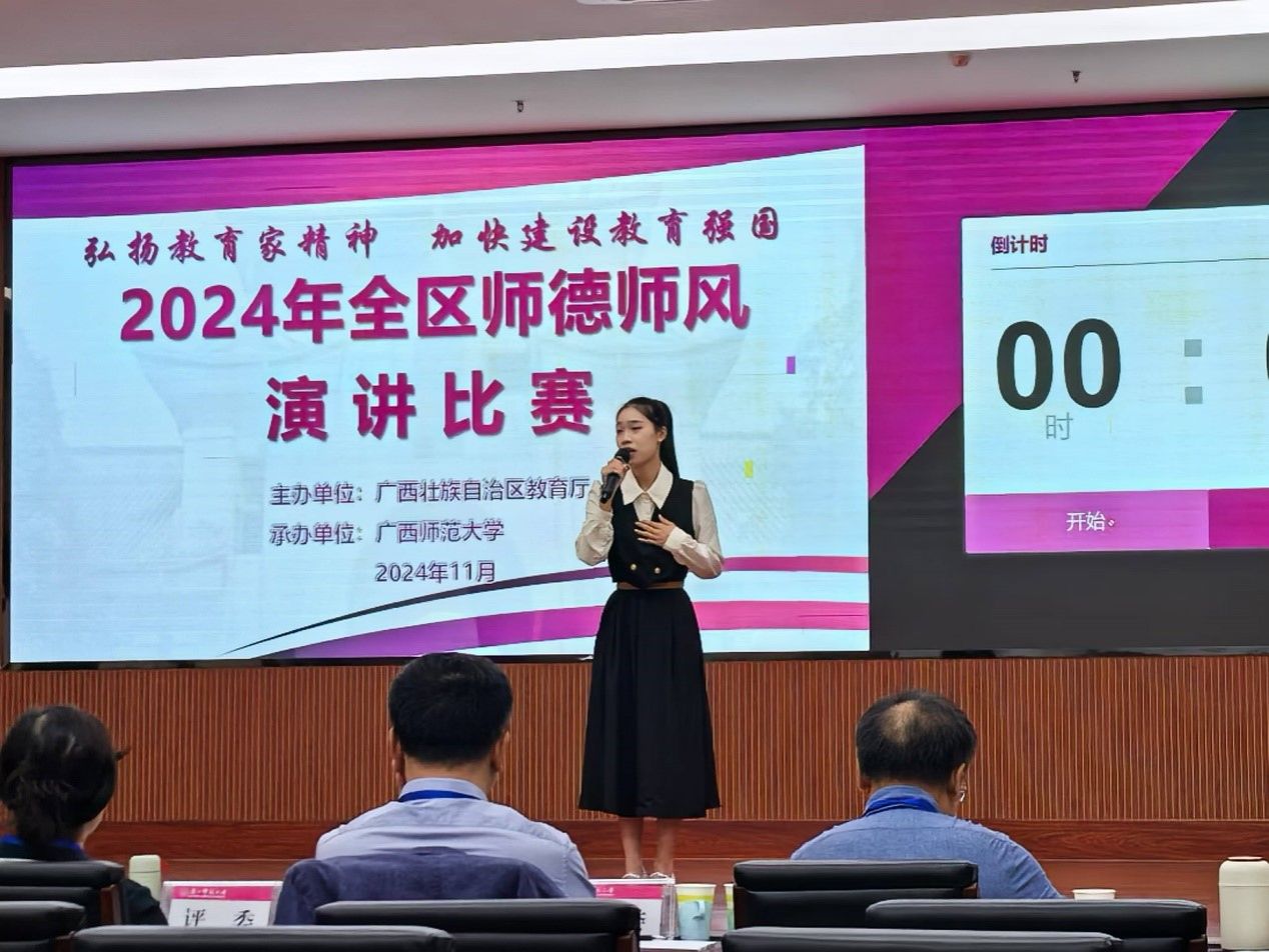 2024年11月17日,由自治区教育厅主办的2024年全区师德师风演讲比赛在桂林落下帷幕,公司思政专业2024级6班的张璐同学荣获高校师范生组一等奖。