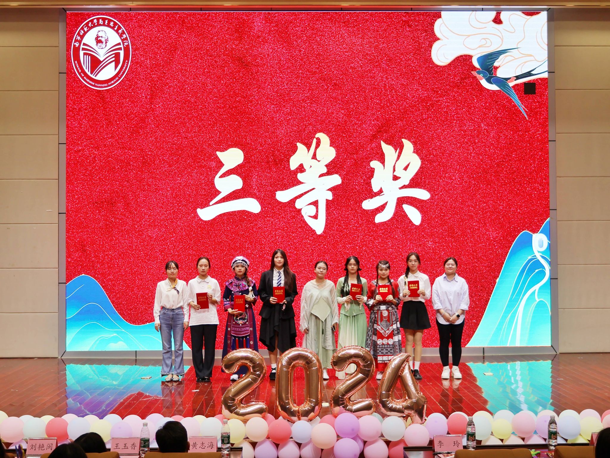 星光璀璨,本次才艺大赛精彩纷呈,新生们能歌善舞,为观众带来了一场丰富多彩的视听盛宴。其中,歌曲《虹之间》富含情感,传播了爱与希望;《我的骄傲》饱含力量,点燃了自信与坚强;舞蹈《睫毛弯弯》青春洋溢,活力四射;合唱《紫荆花盛开》旋律悠扬,激发了观众们的爱国之情;课本剧《红岩》情节紧凑,带领观众深刻感受到那段历史的红色力量。同时,助班节目《知足》表达了助班们对新生们的深情厚意。在互动环节中,观众们热情高涨,积极踊跃回答问题,将现场的气氛推向了高潮。