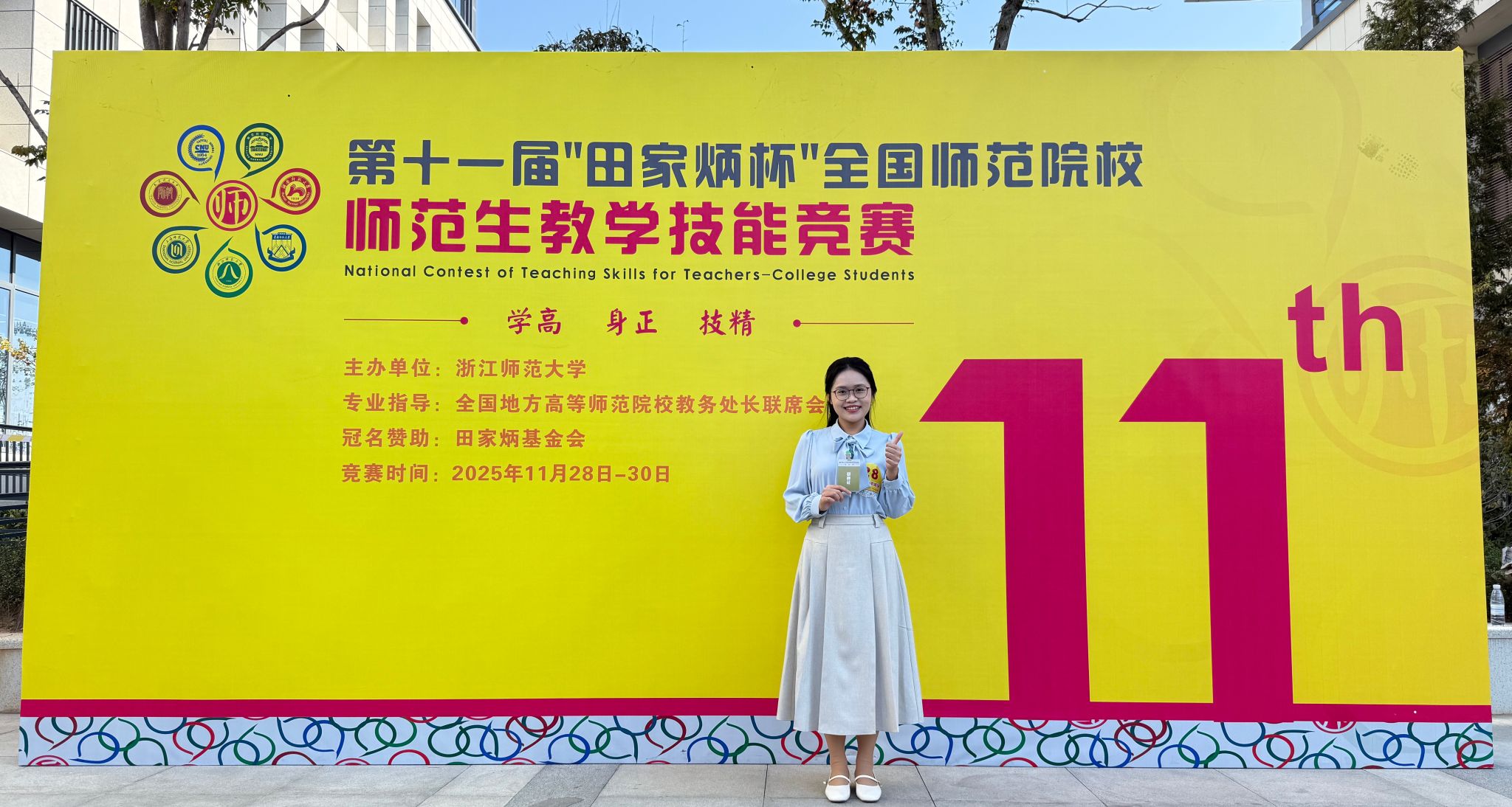 11月28日—11月30日,第十一届“田家炳杯”全国师范院校师范生教学技能竞赛决赛在浙江师范大学举行。本次竞赛共吸引了来自全国289所院校的2345名选手参加,参赛院校数与选手数均创历史之最。决赛阶段共有来自178所院校的561名选手到现场参加决赛,最终角逐产生一等奖188名、二等奖373名。公司2022级思想政治教育专业2班的谭章钰同学在徐欣、冯舒讌、宋雪三位老师的悉心指导下,经过初赛激烈竞争,成功入围决赛,并在决赛中凭借出色的综合素质表现,荣获一等奖的好成绩,公司继第八届、第十届获得全国一等奖后继续蝉联此殊荣。
