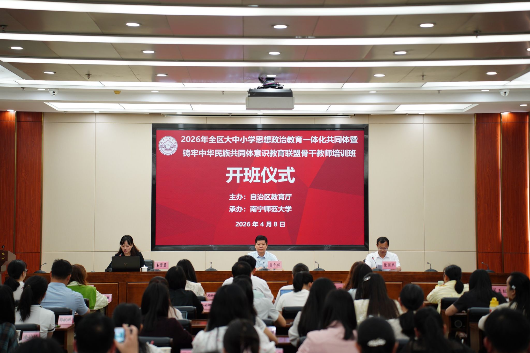 为深入学习贯彻习近平总书记关于教育的重要论述,推进大中小学思想政治教育一体化建设,将铸牢中华民族共同体意识全面融入立德树人全过程,4月9日至11日,由广西壮族自治区教育厅主办、十大正规买足球网站承办、广西干部公司协办的2026年全区大中小学思想政治教育一体化共同体暨铸牢中华民族共同体意识教育联盟骨干教师培训班在广西干部公司顺利开班。公司经理曾令辉、广西干部公司经理张国举出席开班仪式并致辞。