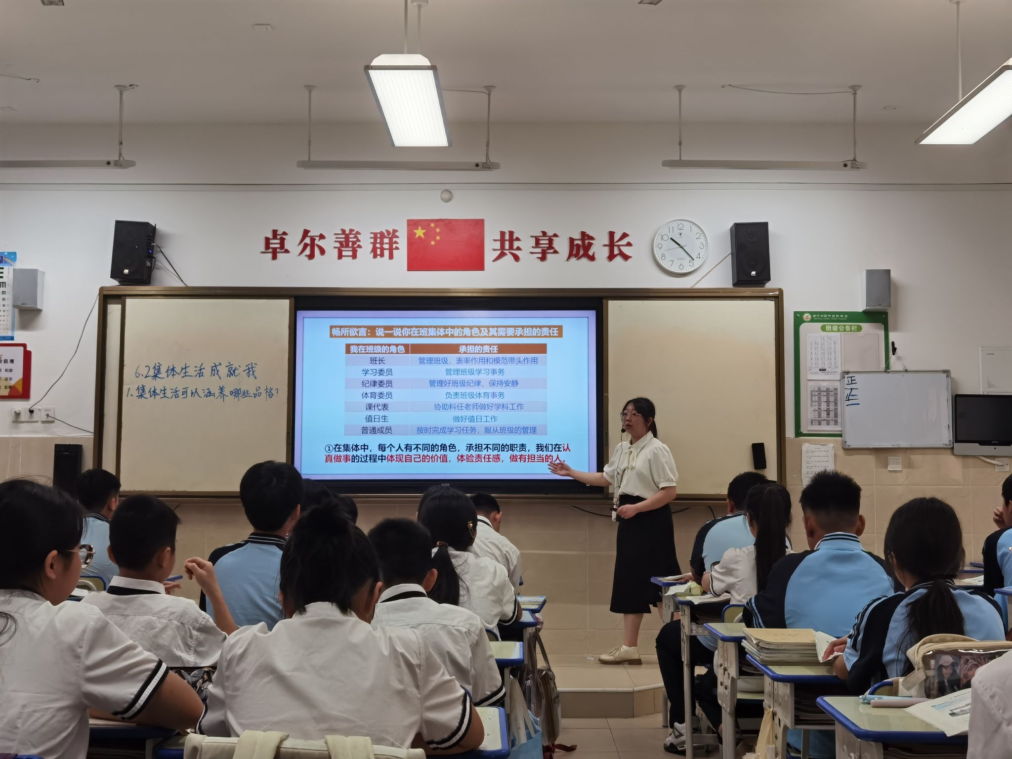 随后,原理党小组的党员教师们来到七(6)班和七(1)班课堂,现场听了实习生谢璐遥的“集体生活成就我”和实习生韦丽芳的“单音与和声”两节课教学,授课教师讲解生动透彻,展现出过硬的教学基本功和扎实的专业素养,课堂上,员工回答问题积极,思维开阔,课堂气氛活跃。课后,两位授课实习生结合自己在本次课教学中存在的问题进行教学反思。
