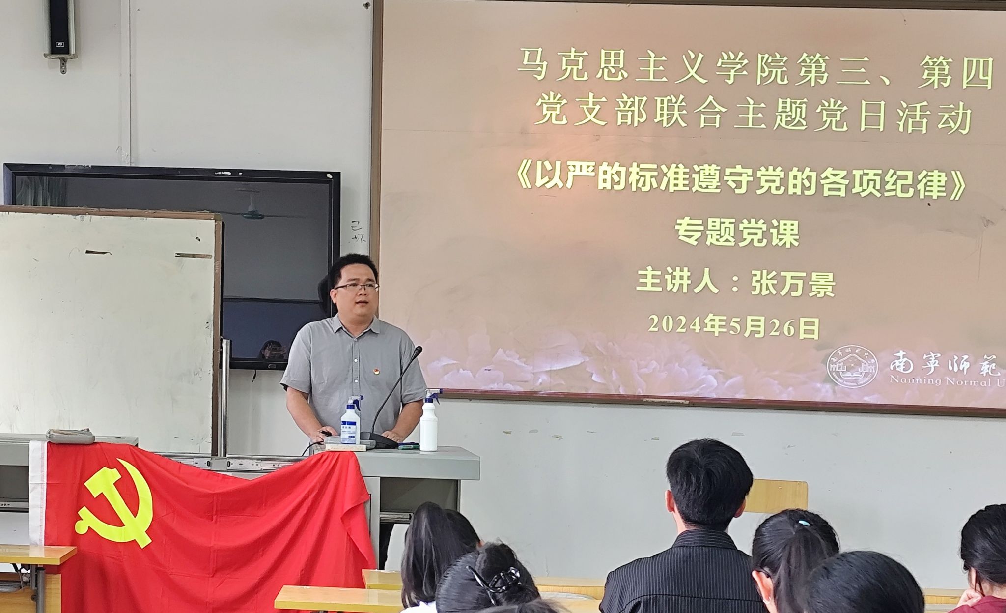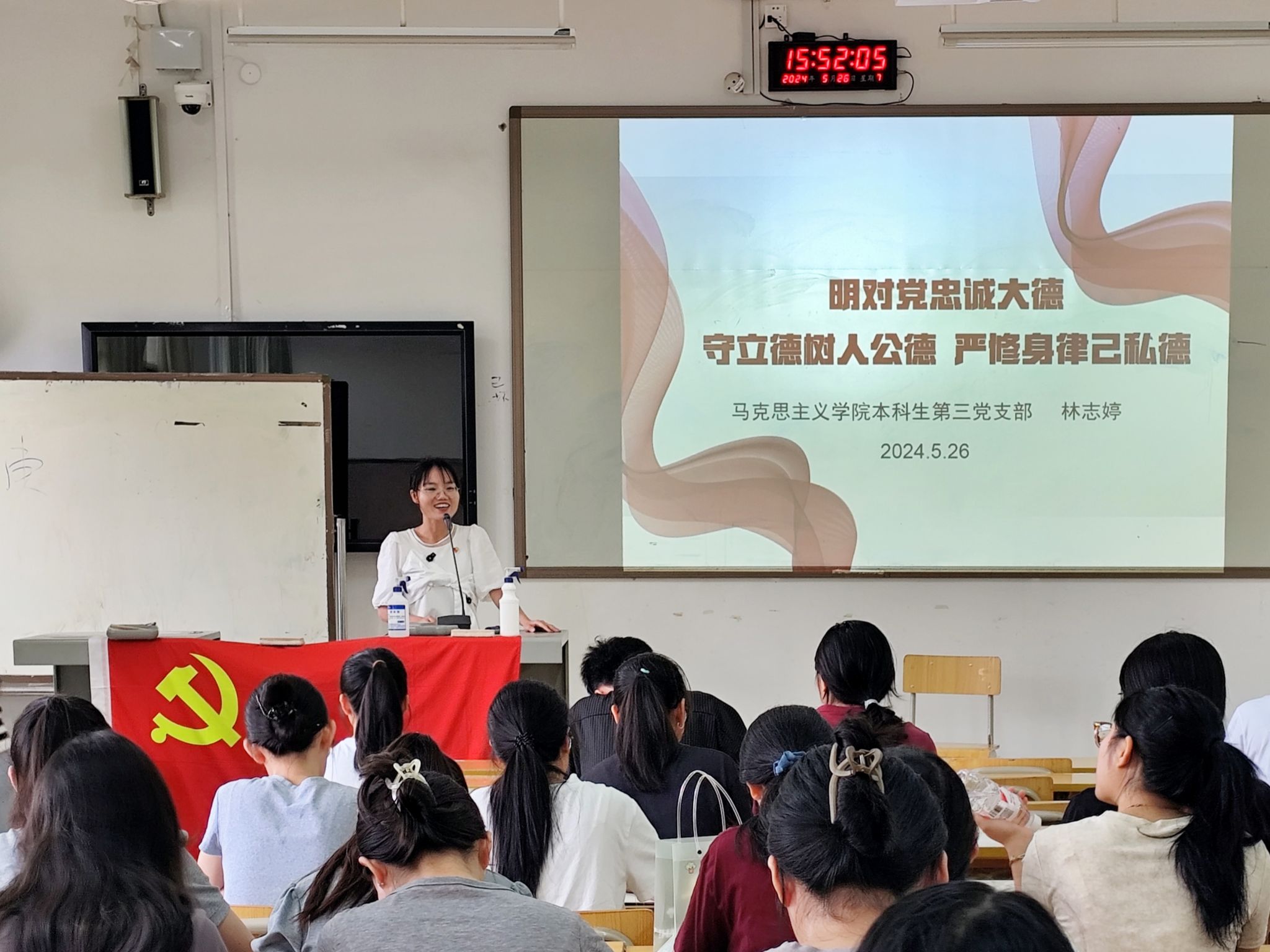 为从严抓好党的纪律建设,进一步深化对加强党的纪律建设重要性和忽视党纪、违反党纪问题危害性的认识,推动广大党员强化遵守纪律的自觉,根据党纪学习教育工作安排,十大正规买足球网站本科生第三、第四党支部于2024年5月26日下午在五合校区五综211教室开展了党支部书记讲纪律党课暨“学党纪,明底线,知敬畏”主题党日活动,参与本次党日活动的有十大正规买足球网站本科生第三党支部书记林志婷、第四党支部书记张万景以及两个支部的全体党员。